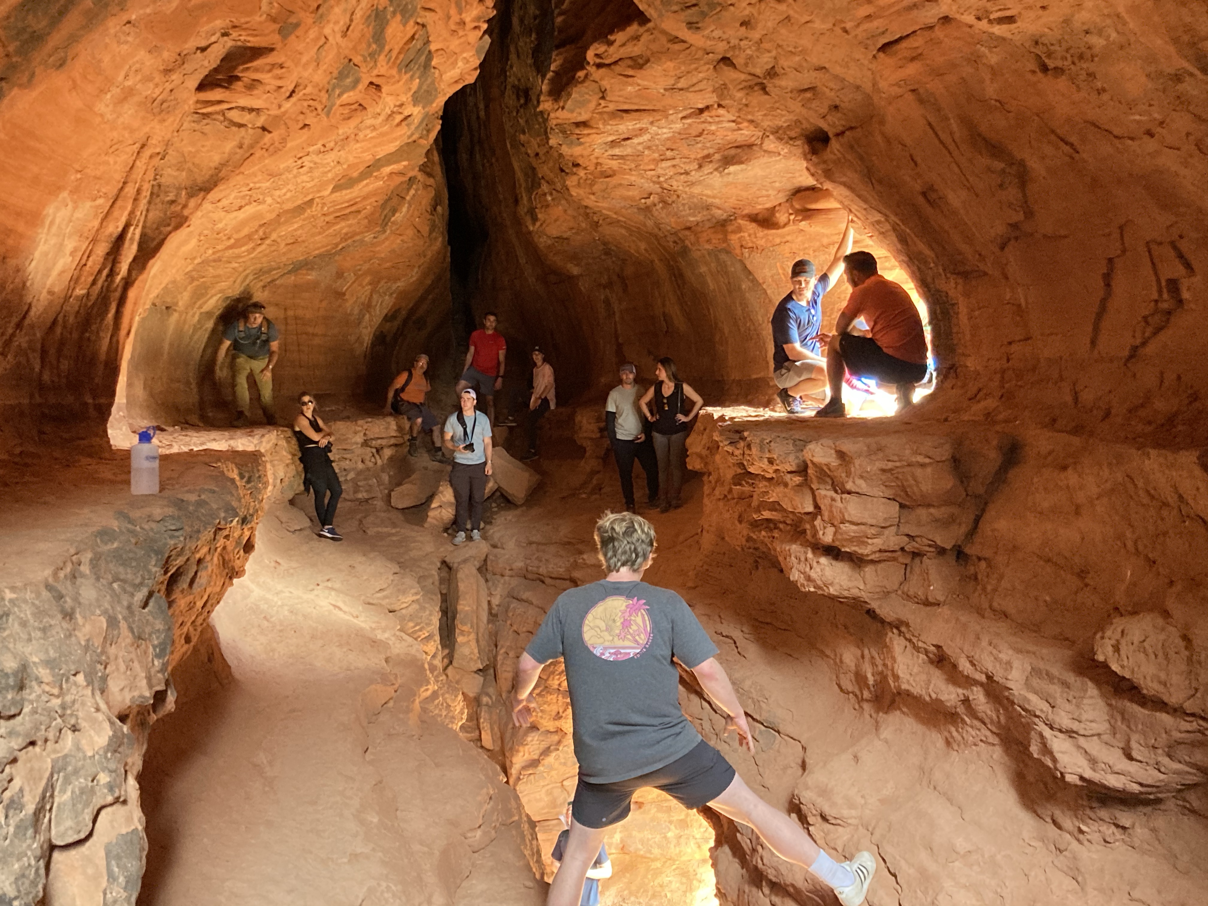 We hiked Soldier’s Pass trail all the way up to the cave passing some amazing natural wonders like Devil’s Kitchen and Seven Sacred Pools. There is a plateau mid-hike that begs a stop to experience the 360 degree red rock formations so vivid you can’t help but question if they could possibly be real or some trick of your imagination. Our ongoing joke was stopping to “drink” in the views as often as possible by looking out and sucking through our imaginary straw.