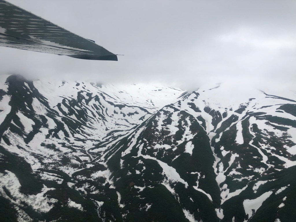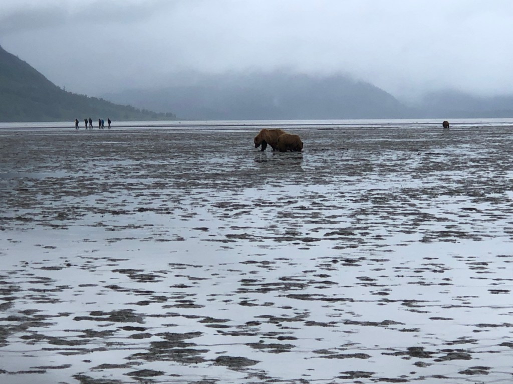 We would later walk out on these clam beds. And to picture this view, imagine walking out into the bay (Its not very deep) its flat, and there are bears all around you. On the way home we took off from the beach and landed back on the runway for the end of the adventure.