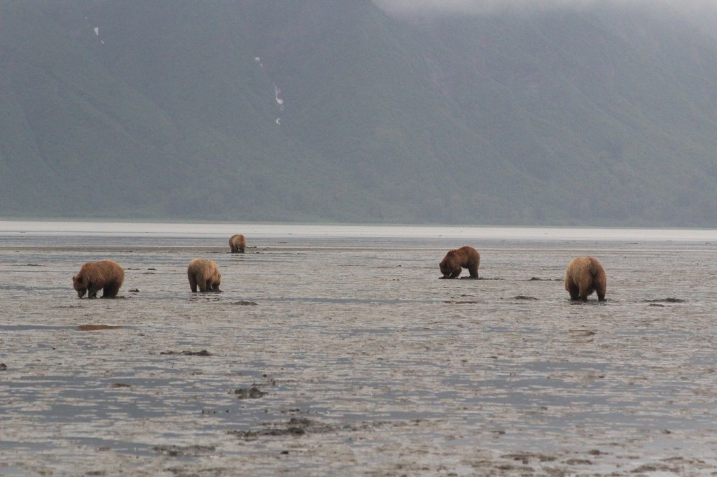 Once we got out of the planes we walked about 1000ft in to the field where their are bears everywhere. There were about 30 bears in sight. Mommas with cubs and males just wondering. These bears are not like normal bears though. These costal brown bears did not care about us in the least. We could get close enough to see the individual furs. When we first got there the bears were after a plant that was high in protein, sedge. This was the start of their day and they would eat a couple hundred pounds of this plant. Next when the tide went out, like I mean out, the bears would run out and dig for the clams. They could smell clam beds through the sand. This was amazing because when the bears would rush out they could cross paths, this would lead to extensive growling and fighting the was right in front of us.