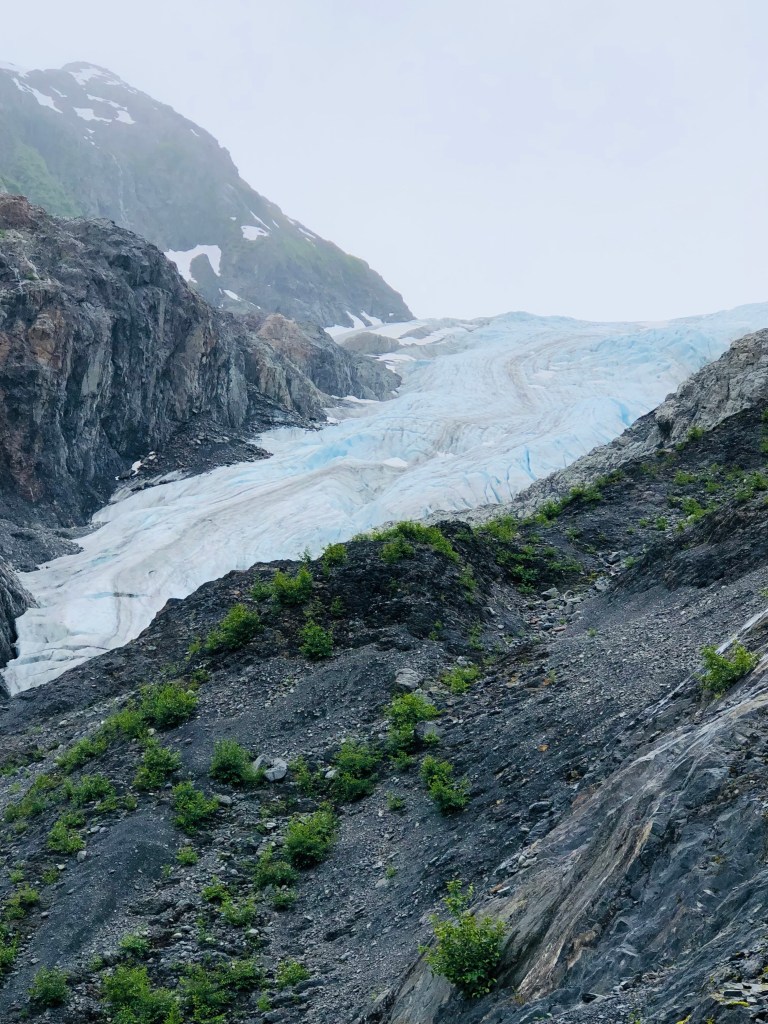 On our way out of Seward, we made the twenty minute drive to Exit Glacier in the Kenai Fjords National Park. There are multiple hiking trails. One will take you all the way to the Harding Icefield over four miles from the hiking start point. Harding Icefield feeds Exit glacier and multiple other glaciers across the area. It stretches seven hundred square miles and is over one thousand feet deep of ice.