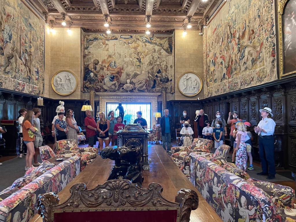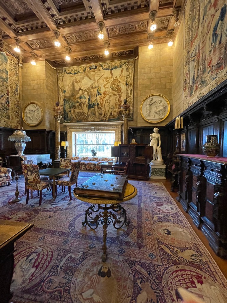 Once we finished staring at the castle sitting upon us, she led us into the “entertainment room.” This room was very big too. But it is a castle, so what can I say? The entertainment room was filled with large tapestries because Mr. Hearst loved tapestries and ceilings. This room had many couches and tables. They would play cards and board games while they drank cocktails.
